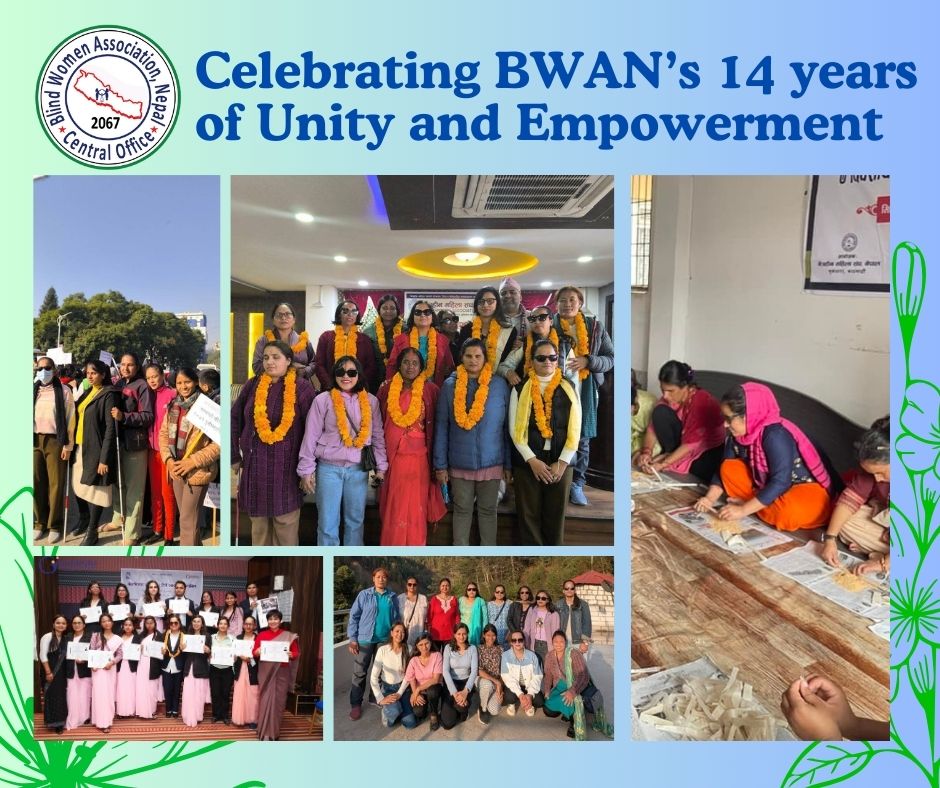 Blind Women Association-Nepal (BWAN) is a non-political and nonprofit social organization led by women. Working as a self-help group, the organization aims to engage in holistic development and empowerment of Blind Women in general and women in particular, by creating equal access to justice, education, employment and social activities that would eventually lead to their fuller inclusions in all spectrums of social, economic, and political development. The organization is determined to minimize and, eradicate all the possible mental and physical harassment mistreatment and violence against all girls.
